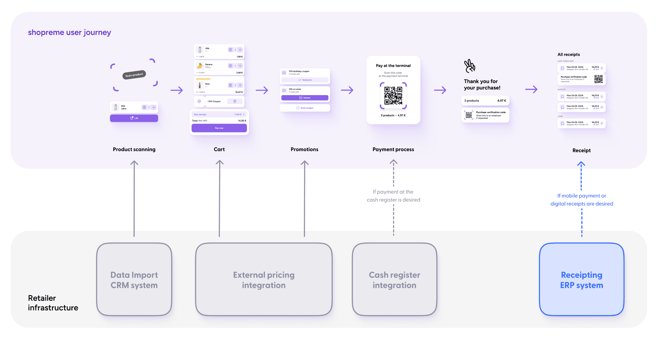 If shopreme handles payment (S&G mobile payment, or snap cart on-device NFC payment) - we integrate with your Payment Service Provider (PSP), handle the payment processing, and send the resulting transaction info (TLOG) to your ERP after every successful transaction.