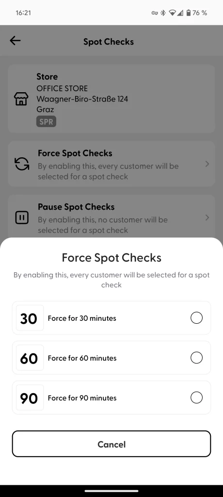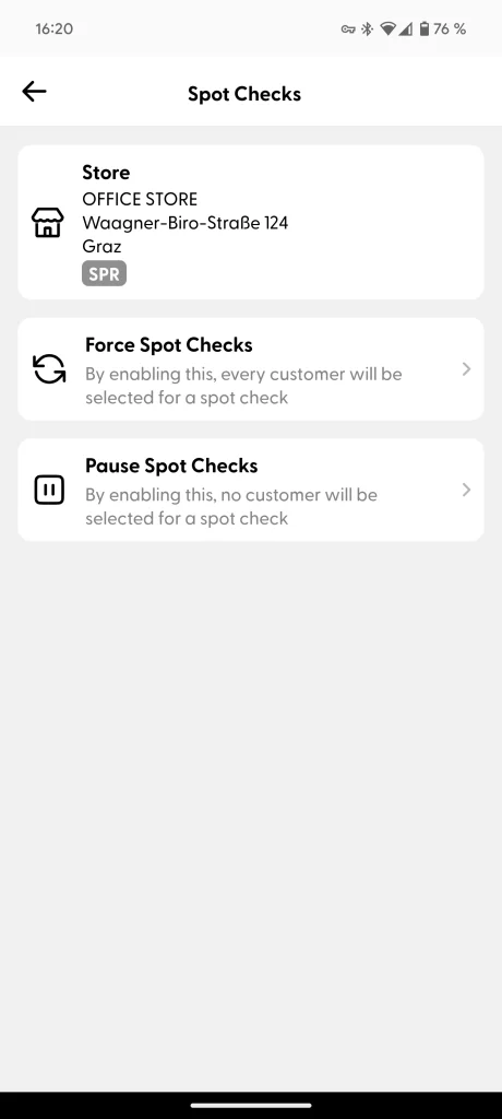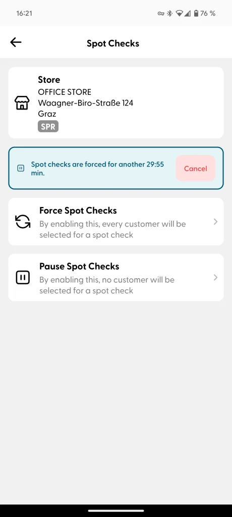 Spot checks are paused for this store: (Early exit condition) Similar to the previous step, store employees can also pause spot checks for a specific time frame. Read more about this process at the end of this page, and in the Supervisor section here.