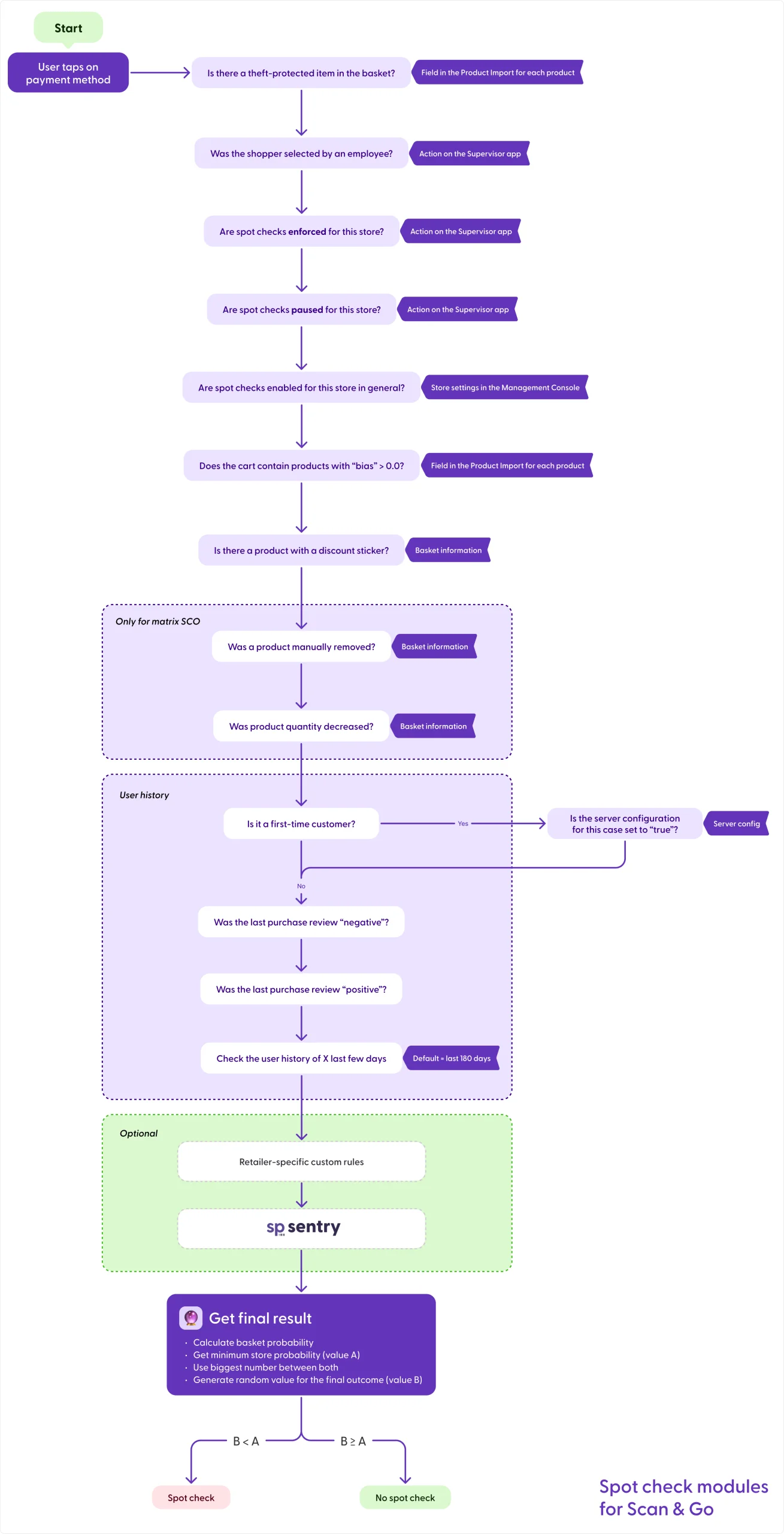 The set of spot check modules and their order may be different, depending on whether a customer is completing the payment process from a Scan & Go client (native app, SDK, or web application) or from the shopreme matrix (Self-checkout Point of Sale). We will explain the differences between both paths below.