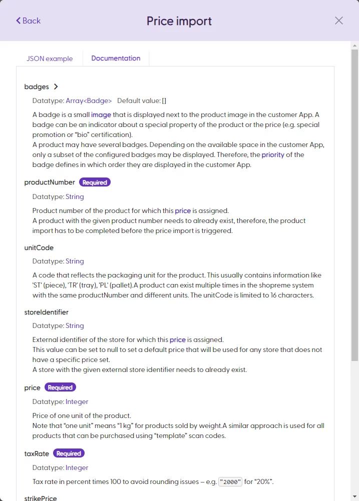 Similarly to the product import example, this JSON example tab shows the expected format and some basic fields, such as productNumber, price, strikePrice and taxRate.