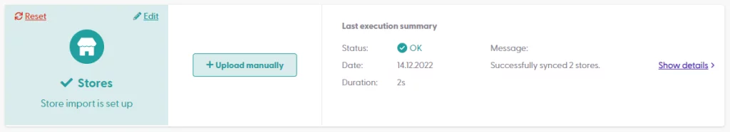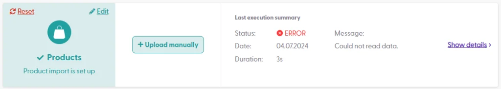 After uploading a JSON file manually, it will be processed like any other import job. Once the update is completed, you can also see the Status of the job’s last execution. To see the full log for the complete import processing, click “Show details,” and a pop-up will appear.