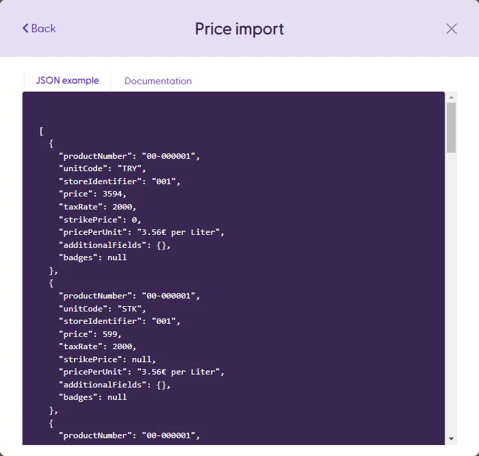 To see an example of the Price Import JSON format, go to the DataHub section > Jobs and then “Edit” in the Price import area.