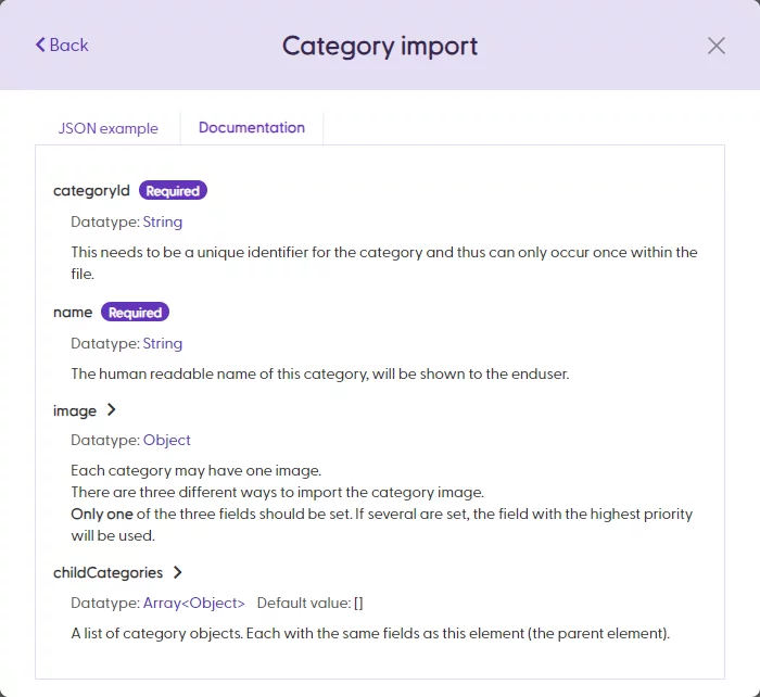 Then, click “Documentation” next to JSON to see the example JSON file and the documentation for each field.