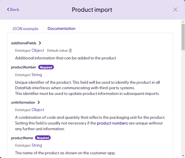 The Documentation tab will provide the descriptions for each field and also highlight the mandatory fields with the “Required” label.