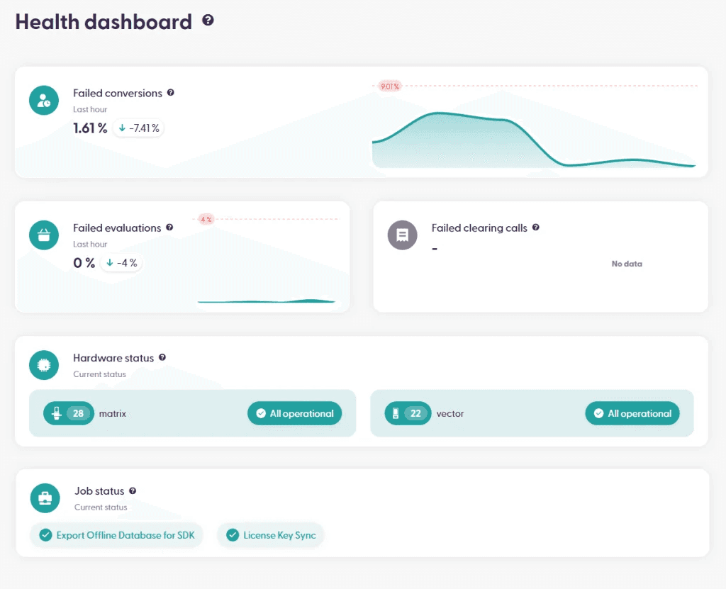Failed evaluations: During the last hour, what percentage of basket evaluation calls (API requests) gave an error response. This could signal an issue with a third-party engine or a product import, for example, if products cannot be recognized in the Scan & Go basket.