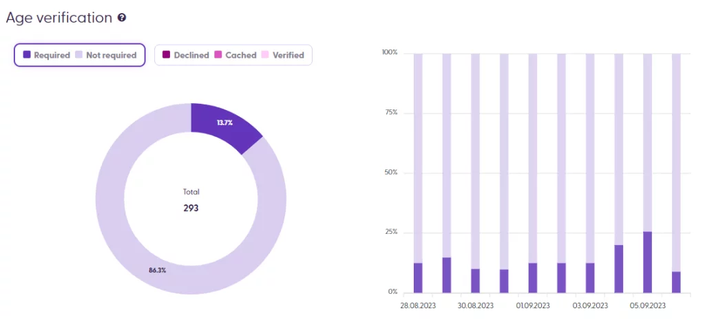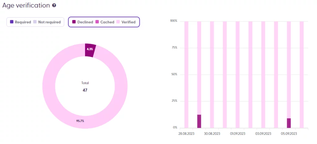 The Age Verification graphs display the information following the same logic as the Spot Check graphs above. The toggle button “Required/Not Required” shows the percentage of shoppers that did or did not need to be age-verified.