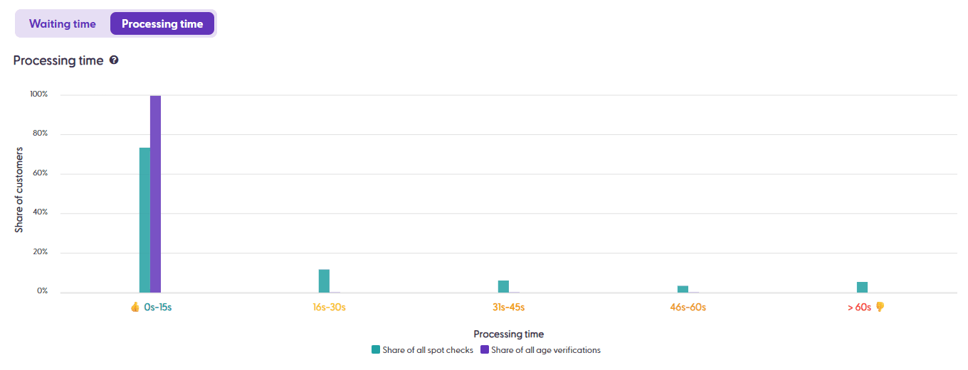 Clicking on the “Processing time” button will switch the chart’s content and display the time spent resolving an age verification or a spot check. That is, the processing time starts when an employee starts the process (opens the verification on the Supervisor app) and ends when they confirm an outcome (approve or reject).