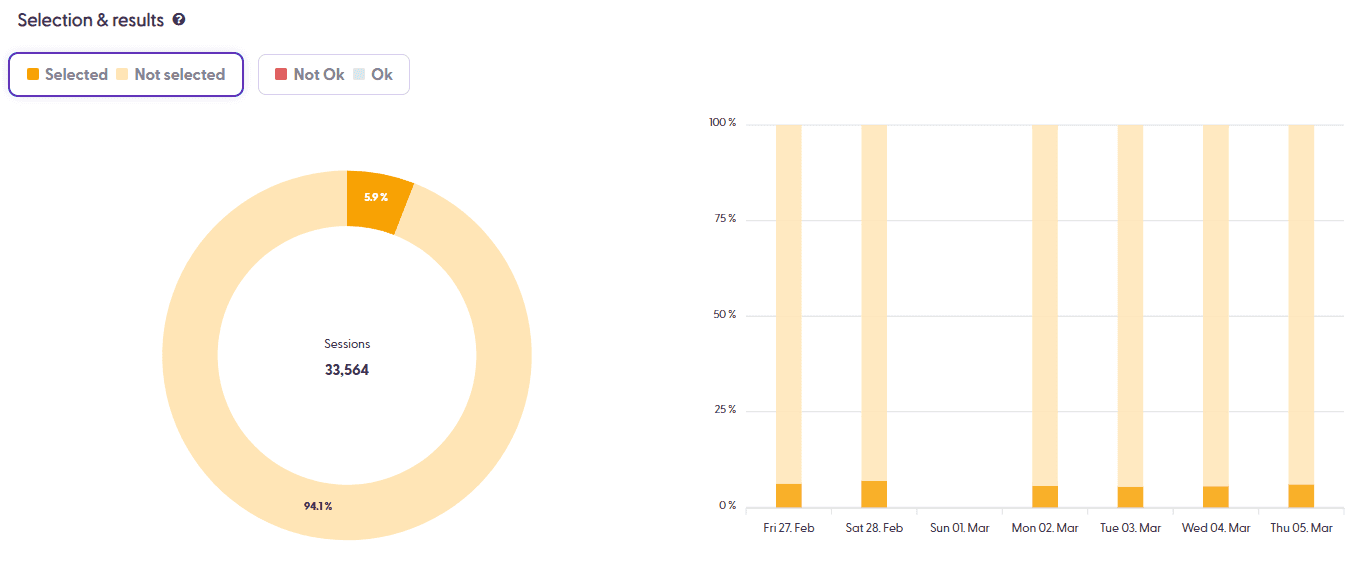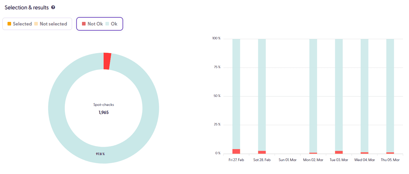 The “Selection & Results” chart offers two views, depending on the information label selected. For example, if you select the “Selected/Not Selected” toggle button, you will see the percentage of shoppers that were selected (lighter color) or not selected (darker color) for a spot check. The circular graph displays the total numbers for the selected time range, while the bar graph shows the share of selections per day by default. The default display will be per week if the selected time range is at least 30 days long, and the default will be per month if the selected time range is at least 90 days.