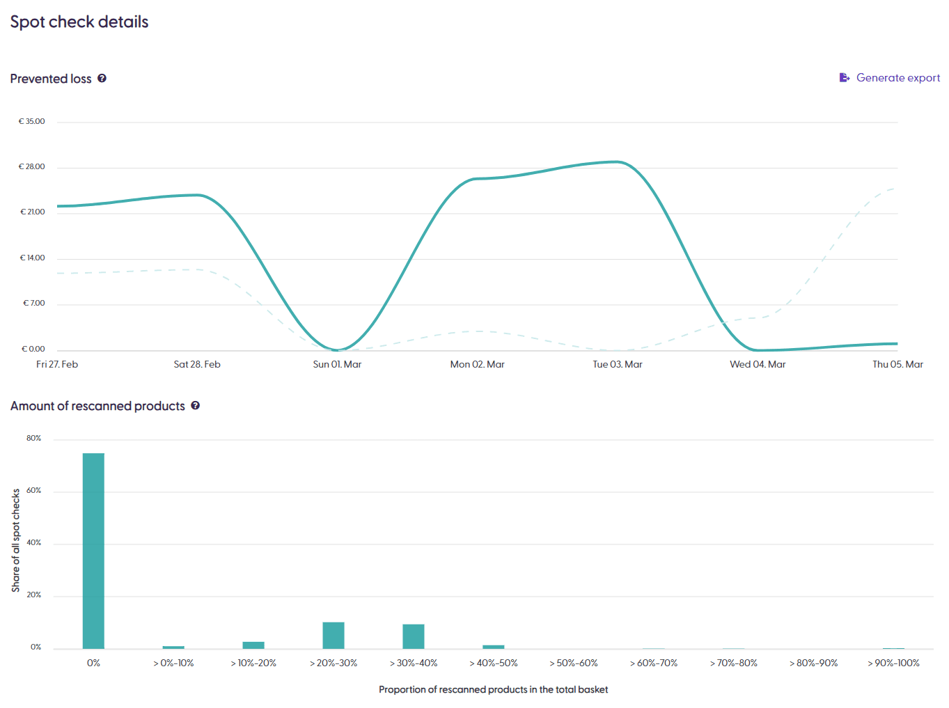 A unique feature that shopreme offers is the Prevented Loss statistics. This graph represents the saved costs by completing spot checks and having shoppers correct the number of products in their carts. For example, if a shopper scanned one “product A” but there are two “product A” in the cart, the employee will reject the spot check and the shopper will need to correct the quantity of products before payment. This will increase the prevented loss chart by the value of 1 missing “product A”. Other considerations for these statistics are: removing discounts to products that had discounts incorrectly, adding missing products, and adjusting product quantities. All the details can be downloaded using the “Generate export” on the top right corner of this graph.