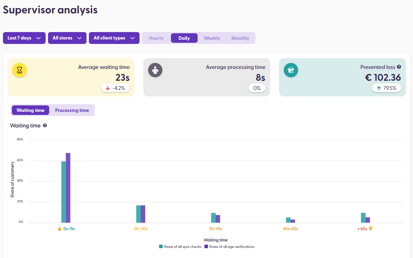 The waiting time graph illustrates the distribution of the number of customers per waiting time group. For example, the chart below shows that 65% of shoppers waited 0 to 15 seconds until an employee verified them during a spot check. Similarly, 5% of shoppers had to wait more than 60 seconds for an age verification.