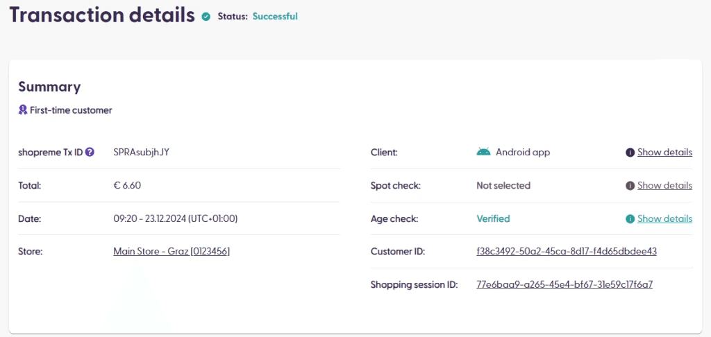 A transaction ID represents the payment process during a shopping session. It starts once the shopper taps “Pay” on the client app. The actions that take place during a transaction are: processing the payment directly (with a saved payment method), loading and choosing available payment methods, triggering an age verification, selecting the customer for a spot check, and saving payment processing information. Closing the payment process (i.e., going back to the cart view) and tapping “Pay” again will create a new transaction ID.
