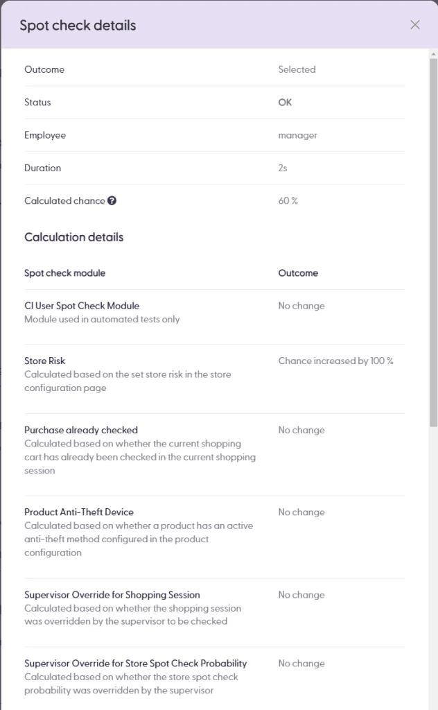 What is the calculated chance? In short, there are different “modules” that increase or decrease a percentage value. After checking all modules, this chance percentage will generate a random number that will be more or less likely to lead to a spot check or not. However, some configurations can trigger a spot check automatically without resorting to chance. For example, it is possible to configure that all shoppers who add 2 discount stickers to their matrix SCO basket will be spot-checked.