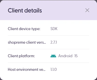 The client details include the device type (SDK, but can also be matrix or portable scanner), shopreme client version (this is the version of the shopreme SDK), the client platform (can be Android or iOS and its corresponding version), and the host environment version (this is the version of the host app, which can be the retailer’s specific app version, not managed by shopreme).