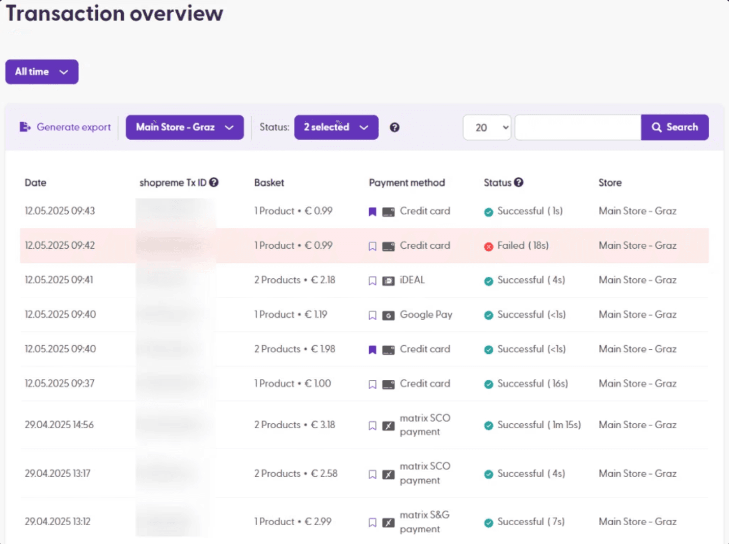 The transactions section lists all payment activity in your shopreme server. A transaction is created when a shopper taps on “Pay” to either choose a payment method or pay immediately with a preselected one. This also means that more than one transaction can belong to the same shopping session. Review the previous section about Shopping Sessions for more information.