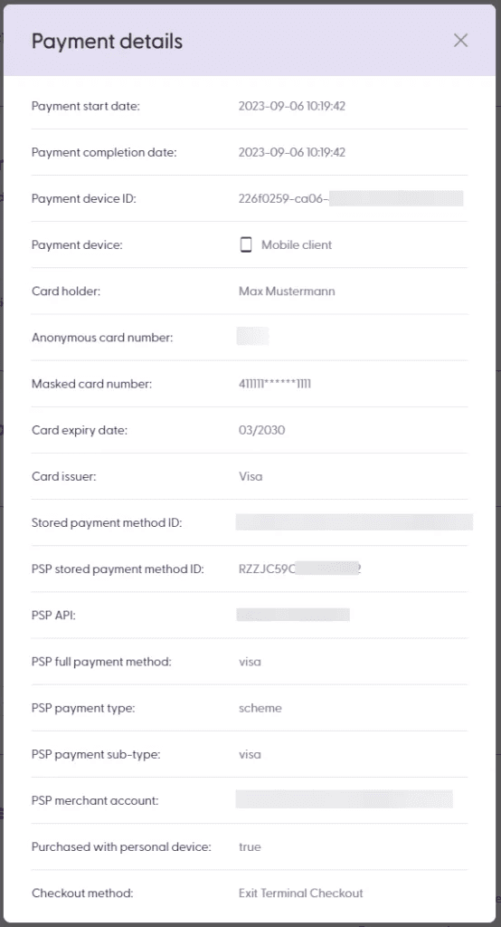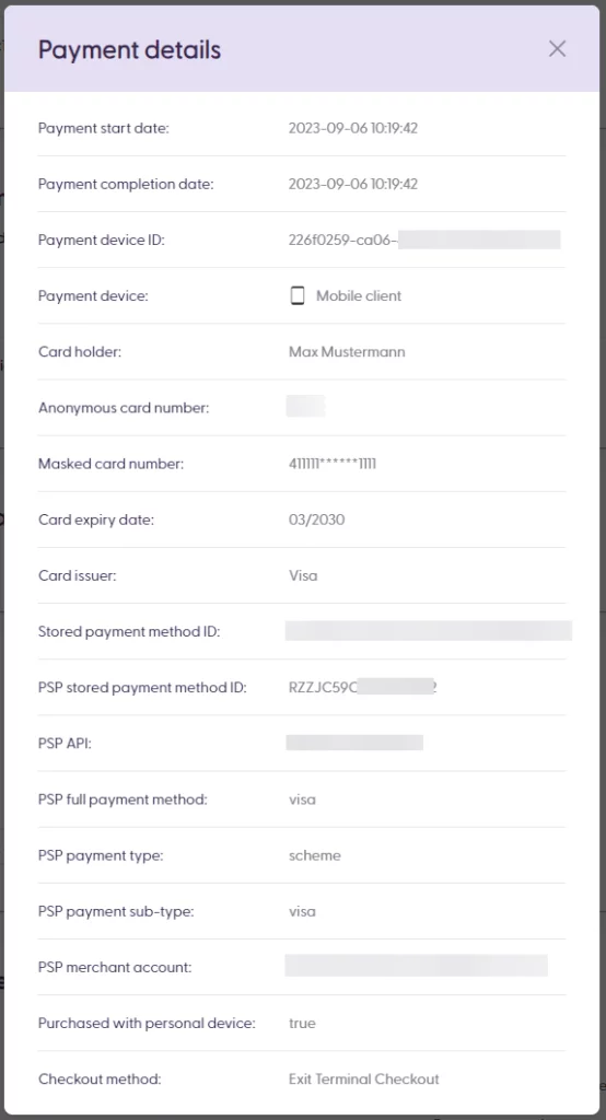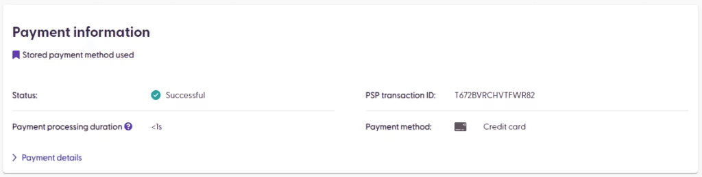 The payment details pop-up shows all the available information as provided by the Payment Service Provider (PSP). The details available will depend on the PSP and what their payment confirmation response contains.