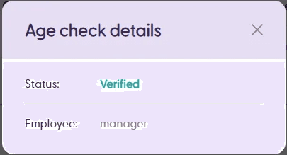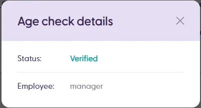 Similarly, clicking on “Show details” next to the Age Check entry will open a modal dialog with more details about this process. This includes the status of the age verification and the username of the Supervisor user who completed the verification.