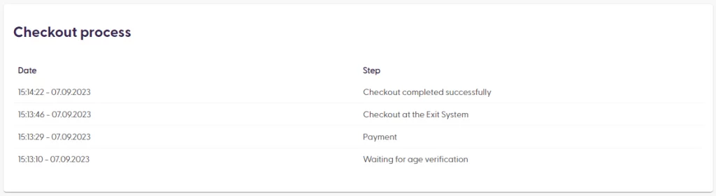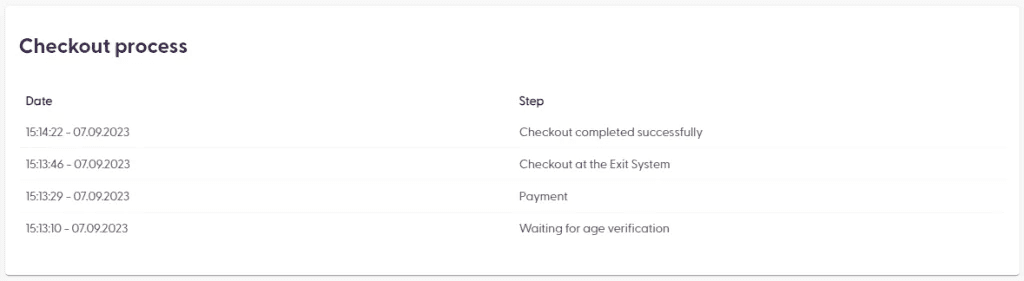 The steps in the checkout process describe the exact steps (or “stages”) taken by the shopper client app. Payment, age verification, spot checks, and checkout at vector are some of the stages listed in this section, along with the timestamp for each stage.
