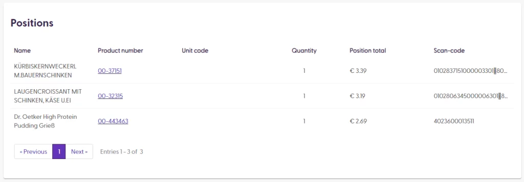A position is an entry on the client app, where a product is displayed. For example, if one bottle of beer is added to the shopping cart in the app, the position will include the bottle and the deposit amount for the glass bottle. Similarly, scanning two or more identical products without special characteristics will show the quantity and product information in the same position, not separately.