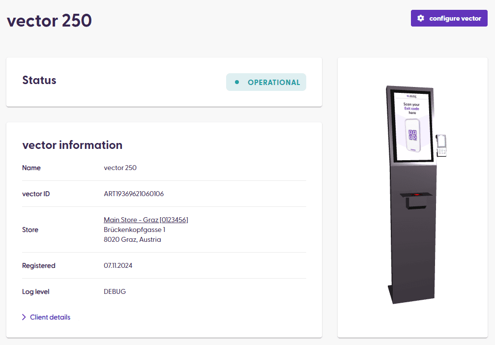 Each vector has its own detail page that provides an overview of the device’s status. For example, the vector information section displays the vector ID, registration date, and log level. You can also see the store name and its external ID in the “Store” line.