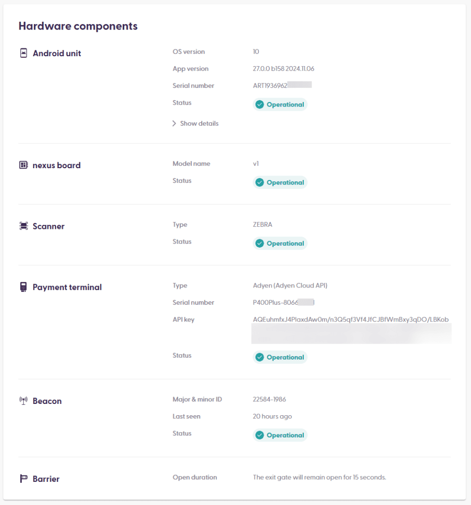 However, the payment terminal can be added or replaced later, as it is an optional component, depending on your user journey. This can be done by clicking the ‘configure vector’ button at the top of the page. If you use the vector as an exit only, you do not need a payment terminal, and the vector will not include a payment terminal connection.