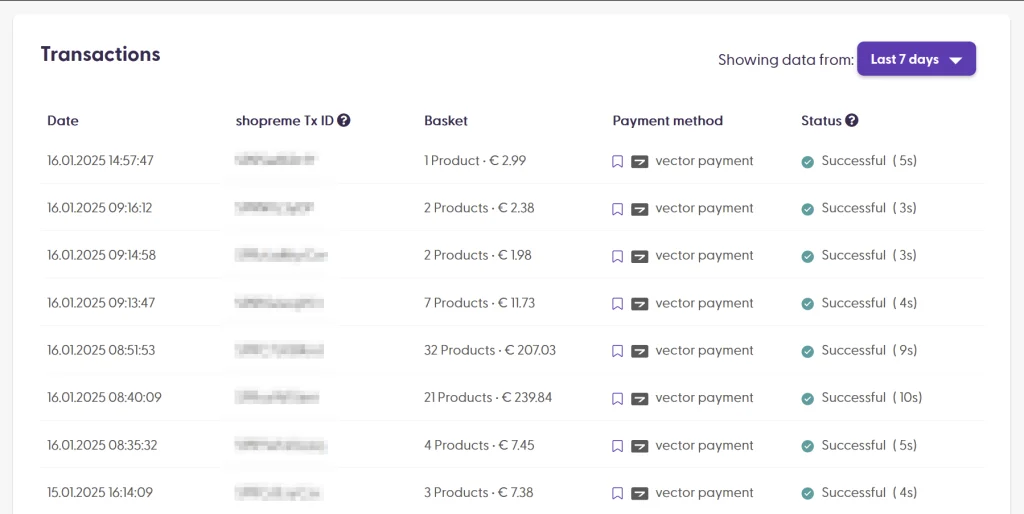 For vectors with a payment terminal, you will find a list of the device’s most recent transactions at the bottom of the detail page. This provides a list that you can filter per day to have an overview of the last transactions completed on this device. Clicking on any transaction in the list will take you to its detailed transaction page.
