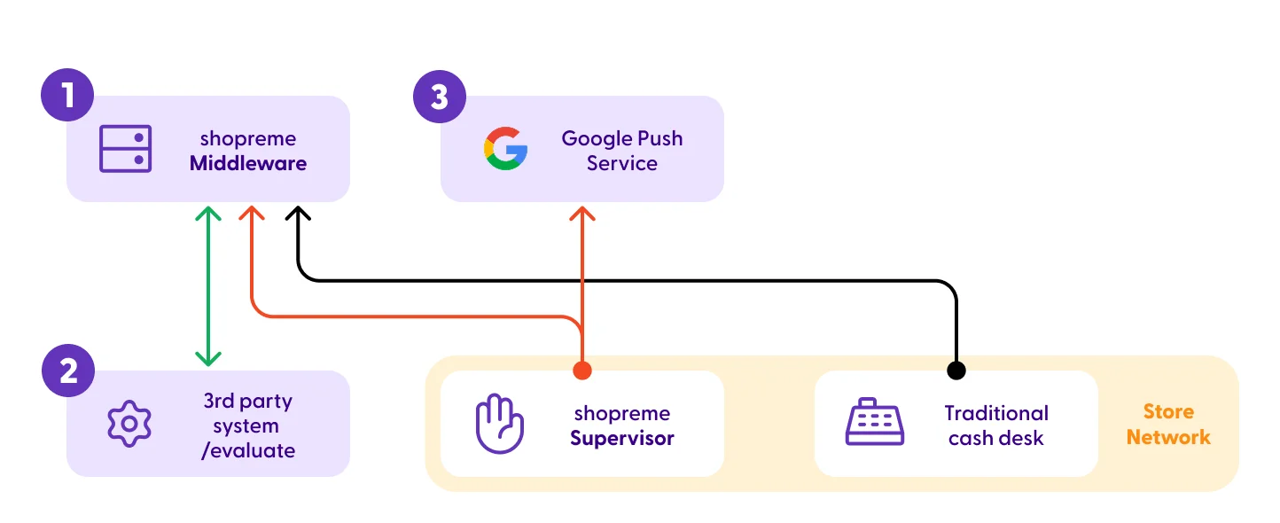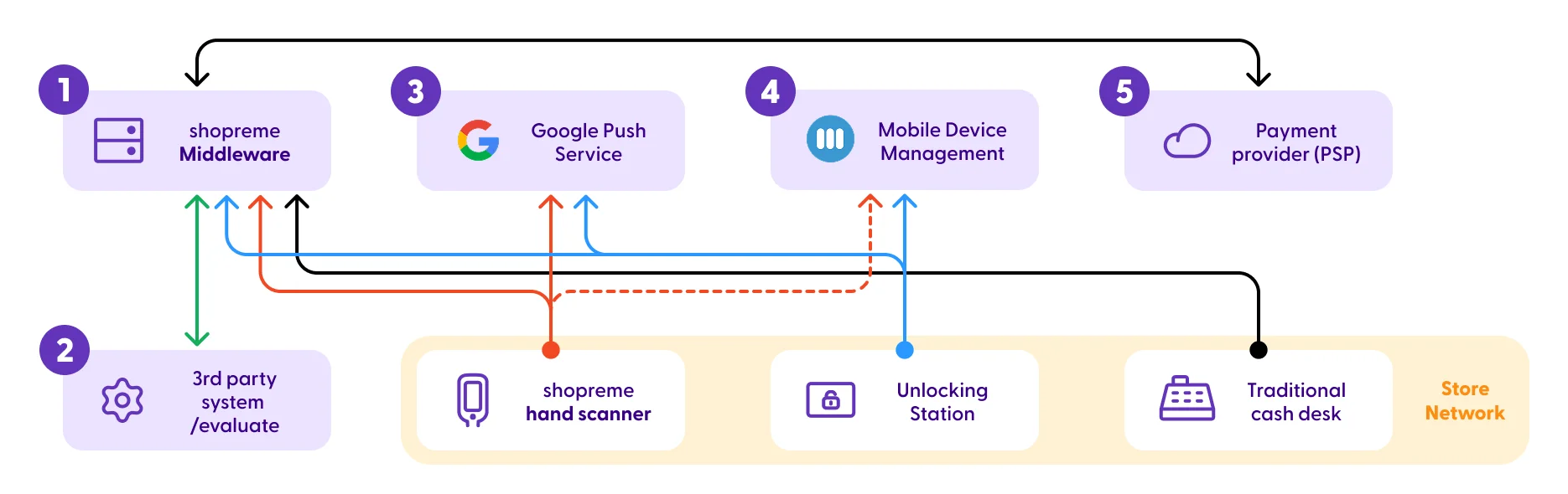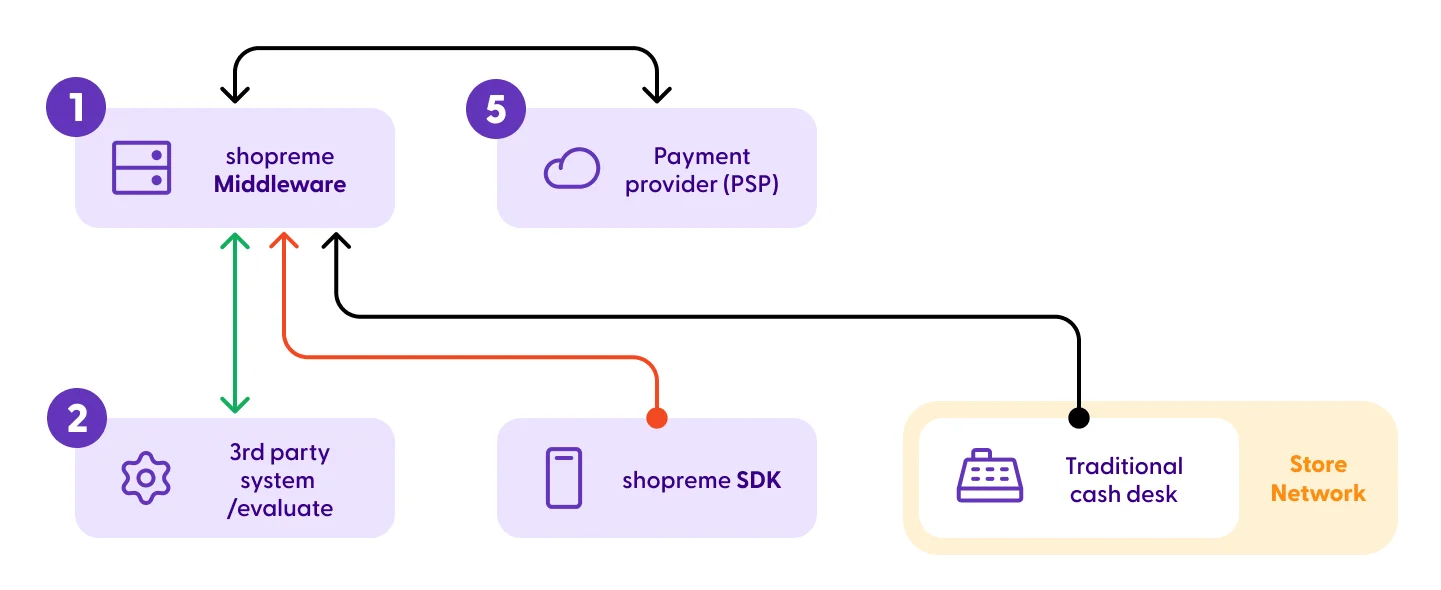 shopreme Middleware: The shopreme backend acts as middleware to handle requests to third-party services, such as payment providers. This means that the shopreme apps do not communicate directly to a payment provider (e.g. Adyen) but to the shopreme backend, which in turn handles the payment logic.